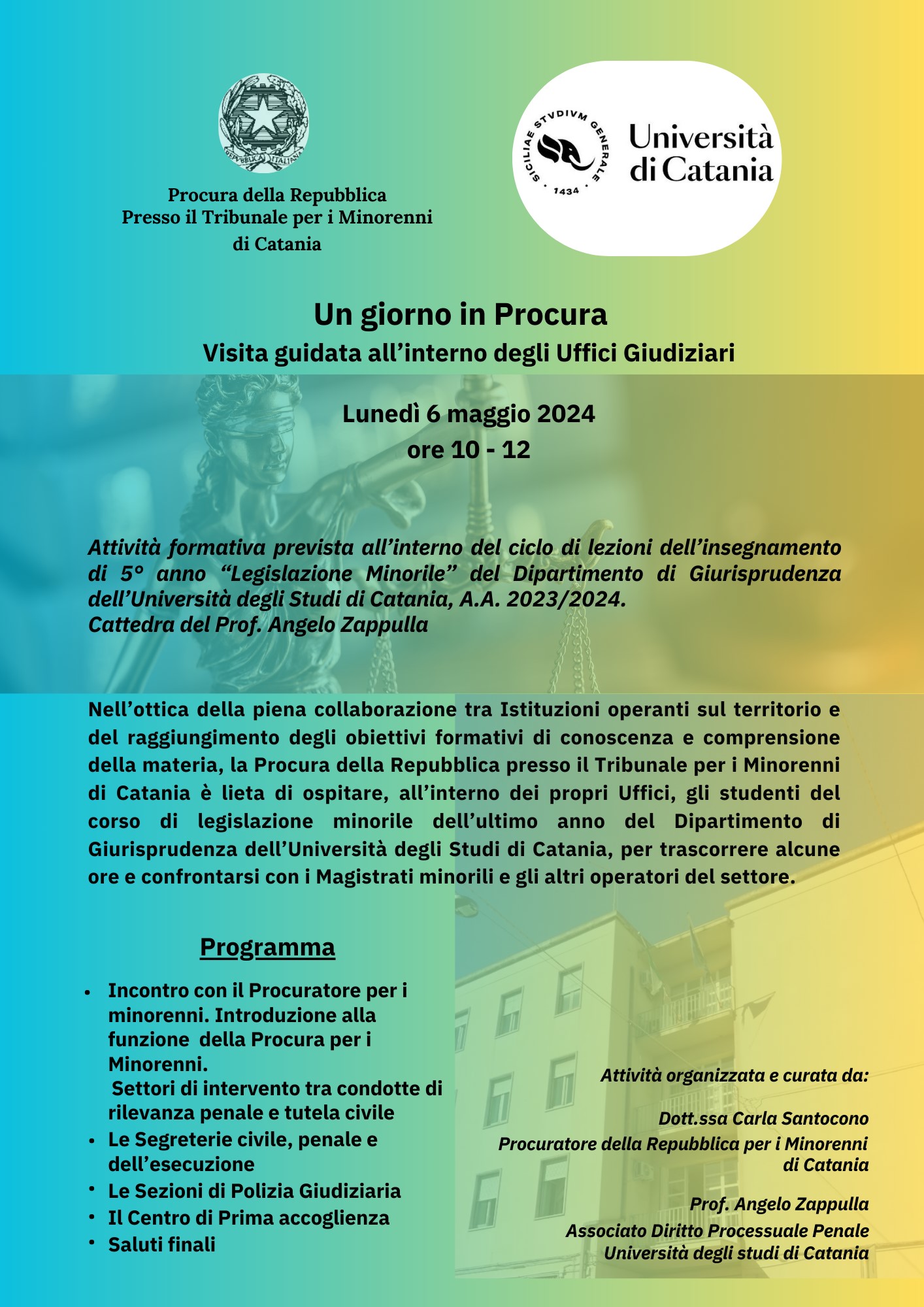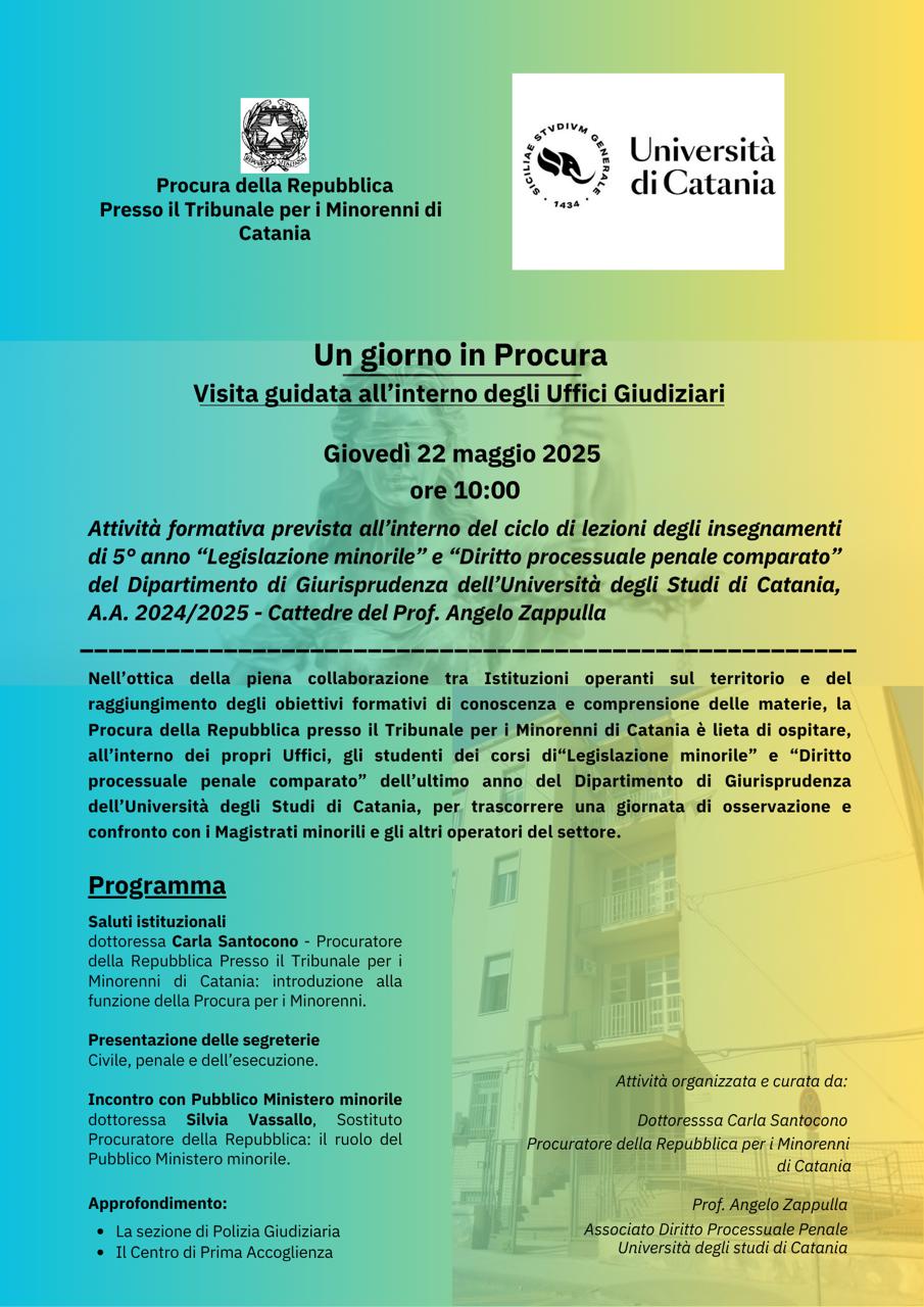 Nell’ottica della piena collaborazione tra Istituzioni operanti sul territorio e del raggiungimento degli obiettivi formativi di conoscenza e comprensione della materia, la Procura della Repubblica presso il Tribunale per i Minorenni di Catania è lieta di ospitare, all’interno dei propri Uffici, gli studenti dei corsi  “Legislazione Minorile” e "Diritto processuale penale comparato" del Dipartimento di Giurisprudenza dell’Università degli Studi di Catania, per trascorrere alcune ore e confrontarsi con i Magistrati minorili e gli altri operatori del settore.